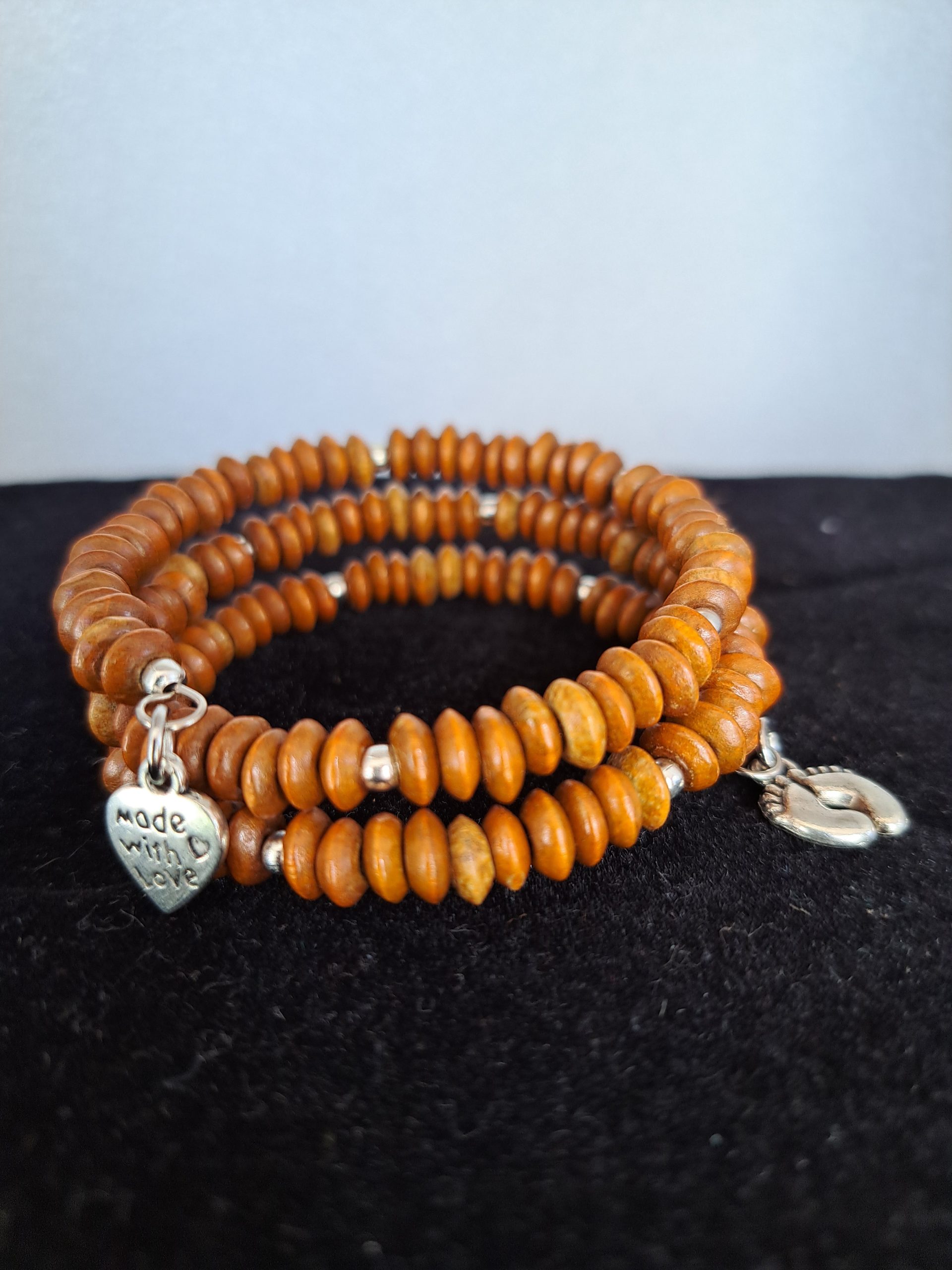 Bracelet/Bangle on spring band made with wooden beads.