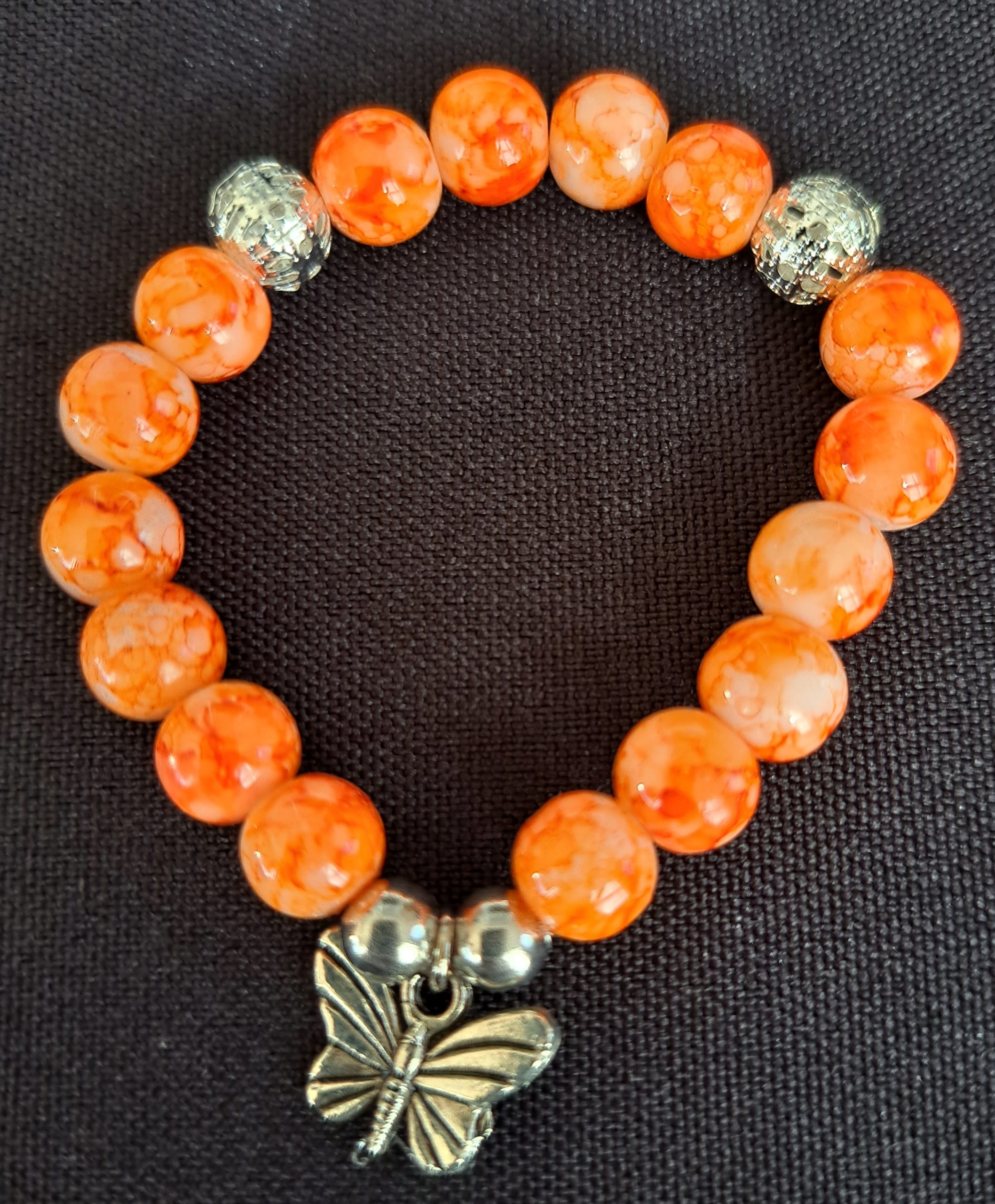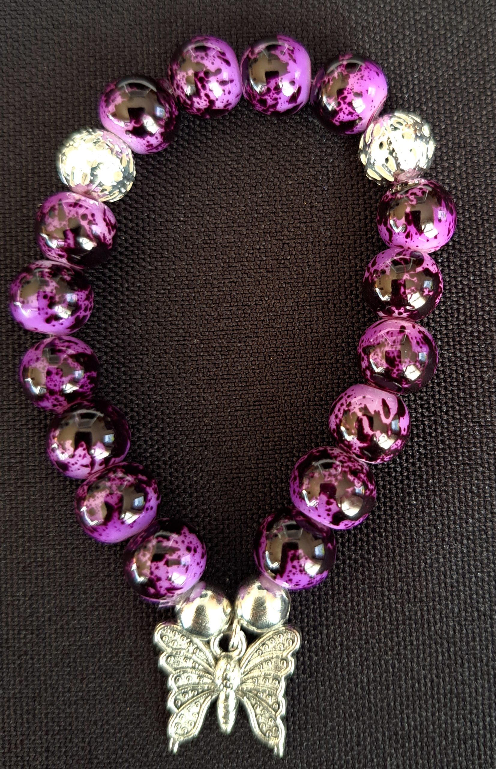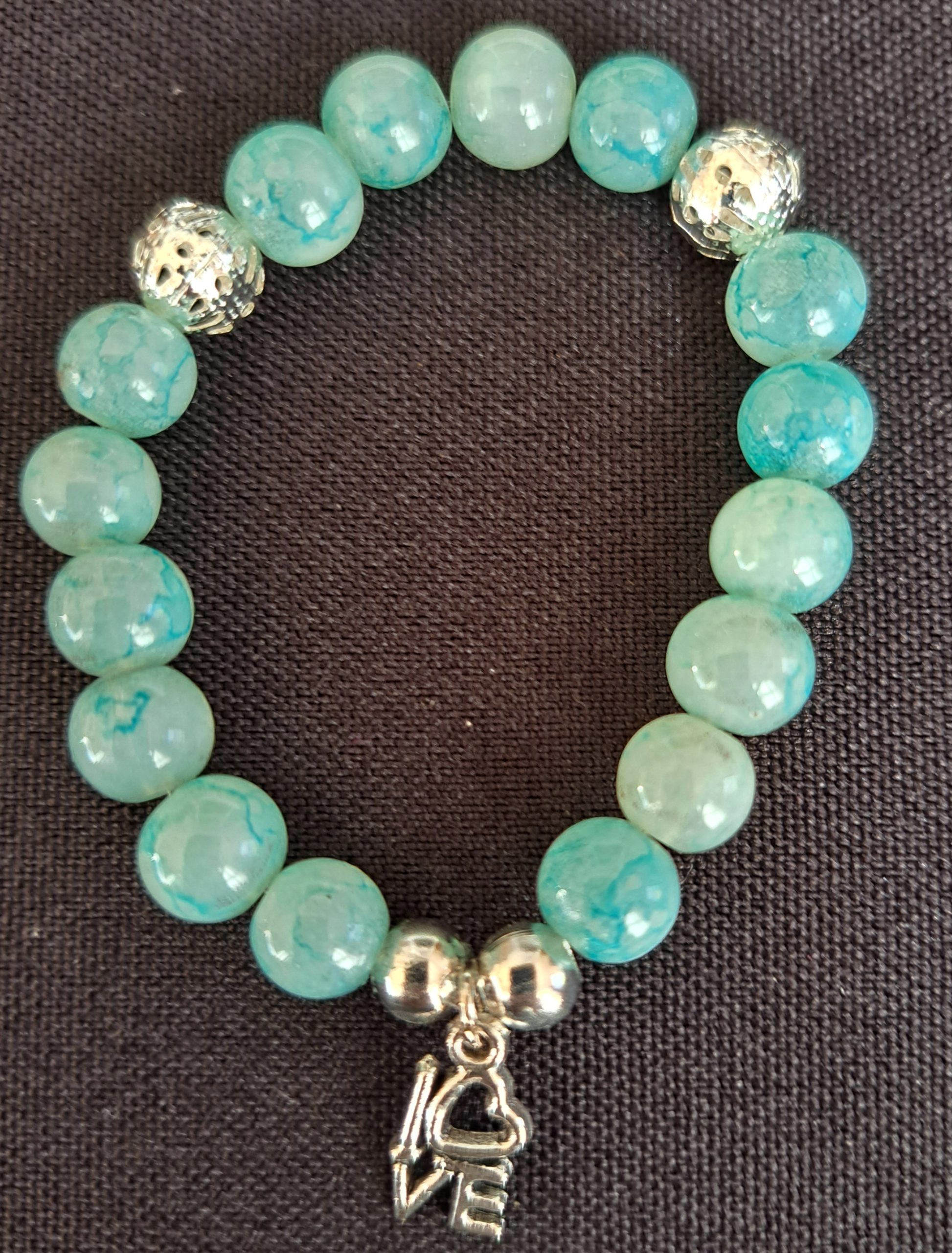 Bracelets on a stretch cord made with glass beads and charms.