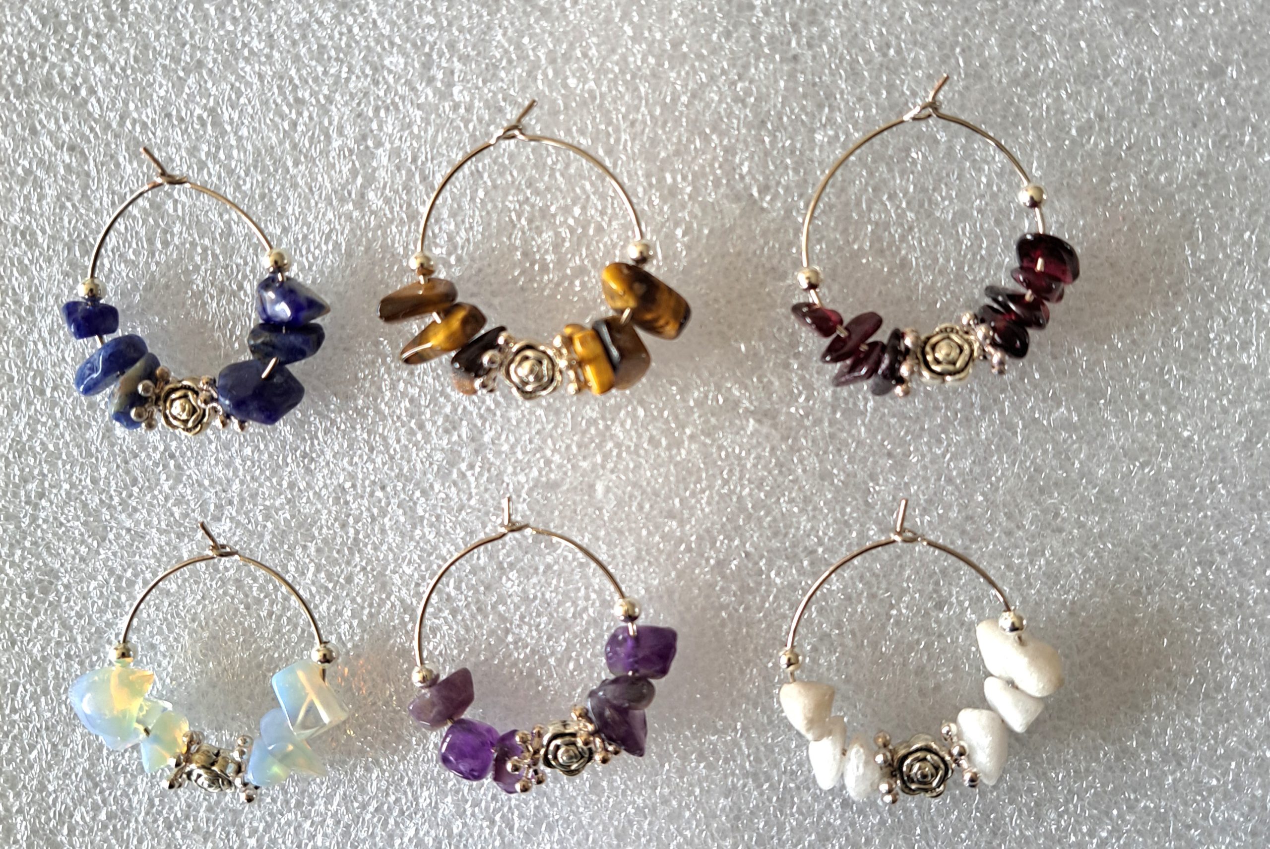 Semi-Precious Stone Wine Glass Charms Set of 6 made with – Opalite, Garnet, Tigers Eye, White Howlite, Amethyst, Lapiz Lazuli stones